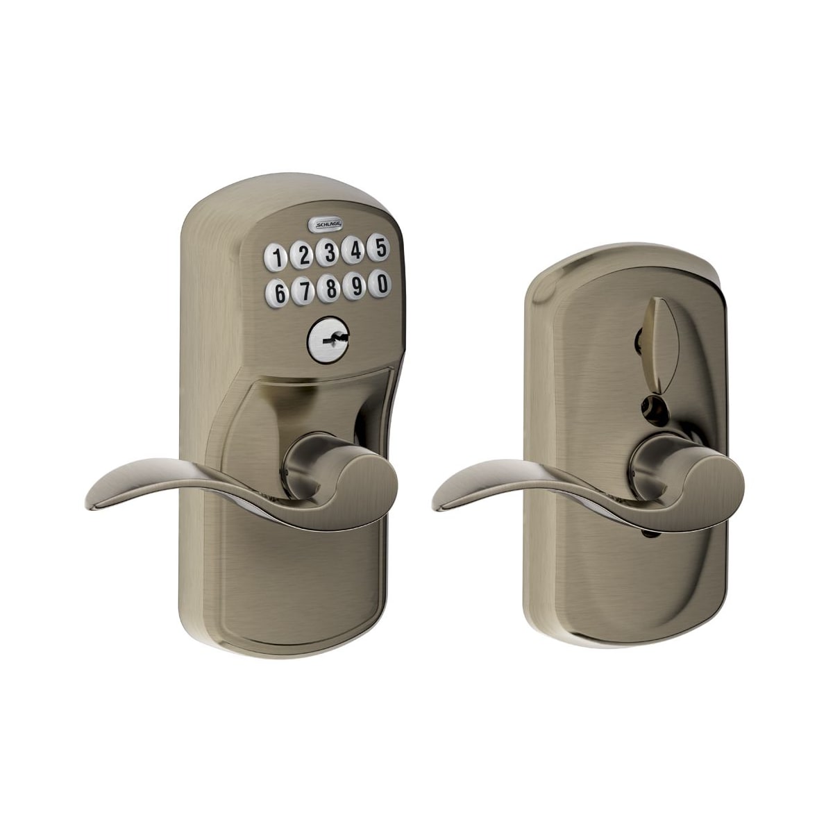 Schlage Fe595ply620acc Antique Pewter Keypad Entry Lock Leverset With Flex Lock And Accent Lever From The Plymouth Collection Handlesets Com